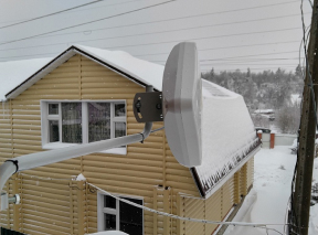 Снаружи здания устанавливается антенна, которая усиливает сигнал и передает в модем. Антенна монтируется на кронштейн или мачту, далее кабель от неё протягивается в дом.