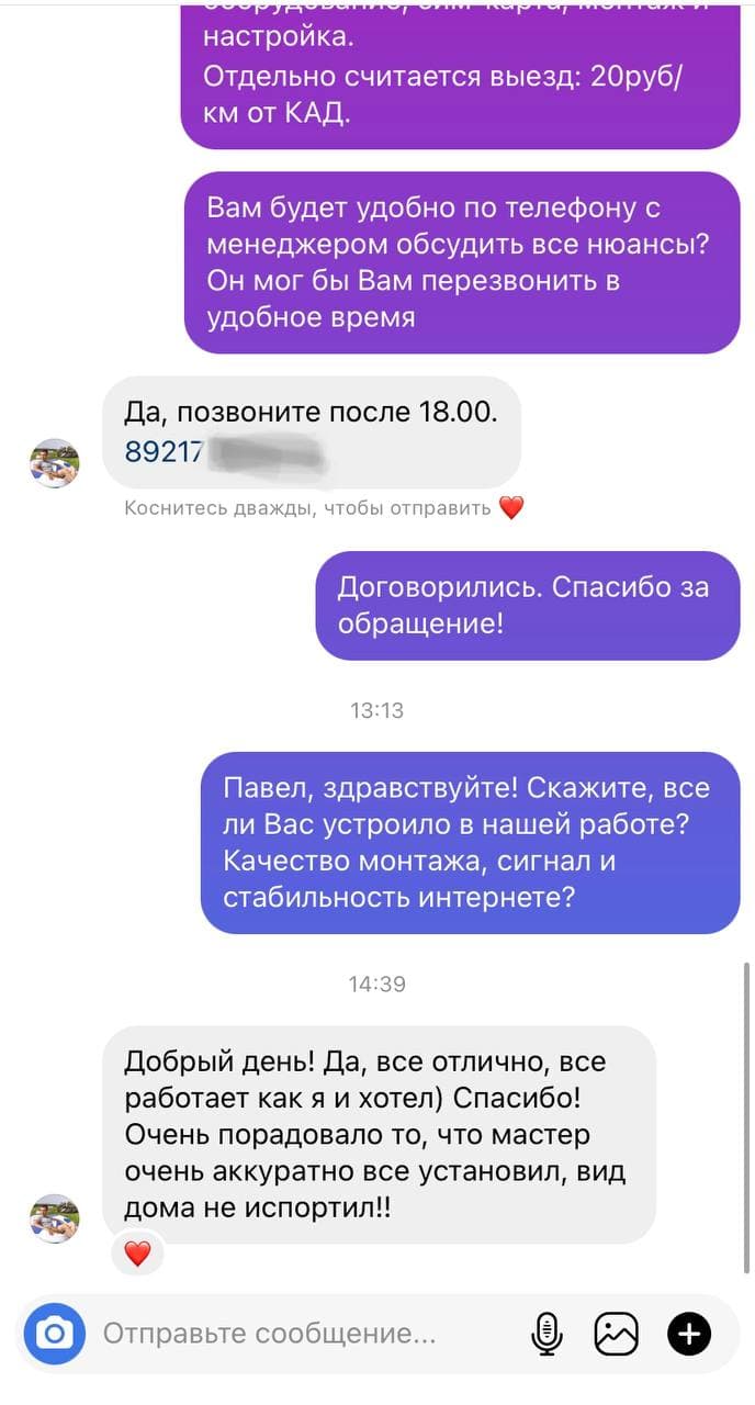 Вместе с абонентом установщик тестирует качество интернета, замеряет скорость и работоспособность на территории вокруг частного дома. После приема выполненной работы абонент рассчитывается за выбранное оборудование, сим-карту оператора и выполнение монтажа.