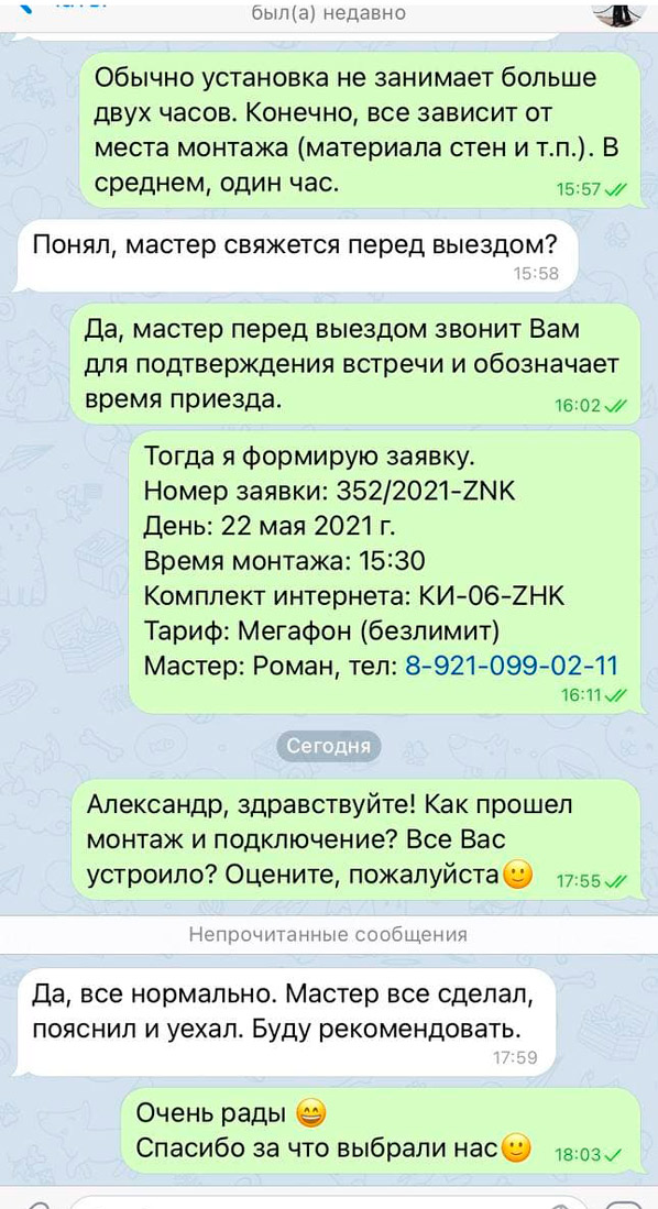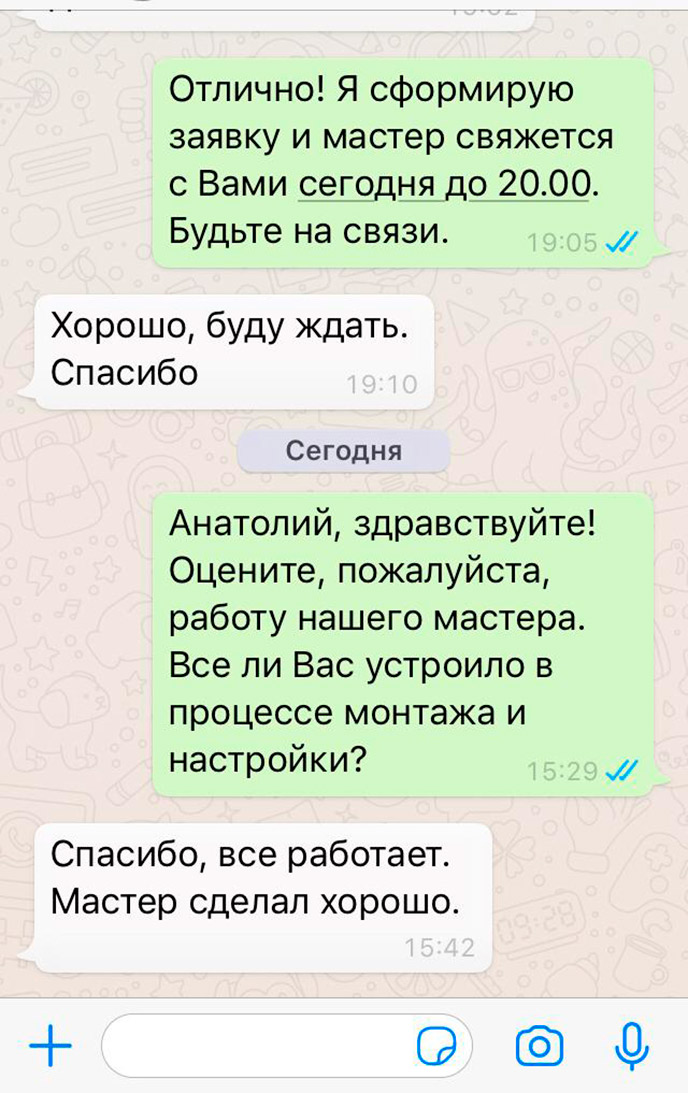 Поcле получения заявки согласовываем по телефону дату и время выезда монтажников (работаем 7 дней в неделю). Вызвать специалиста